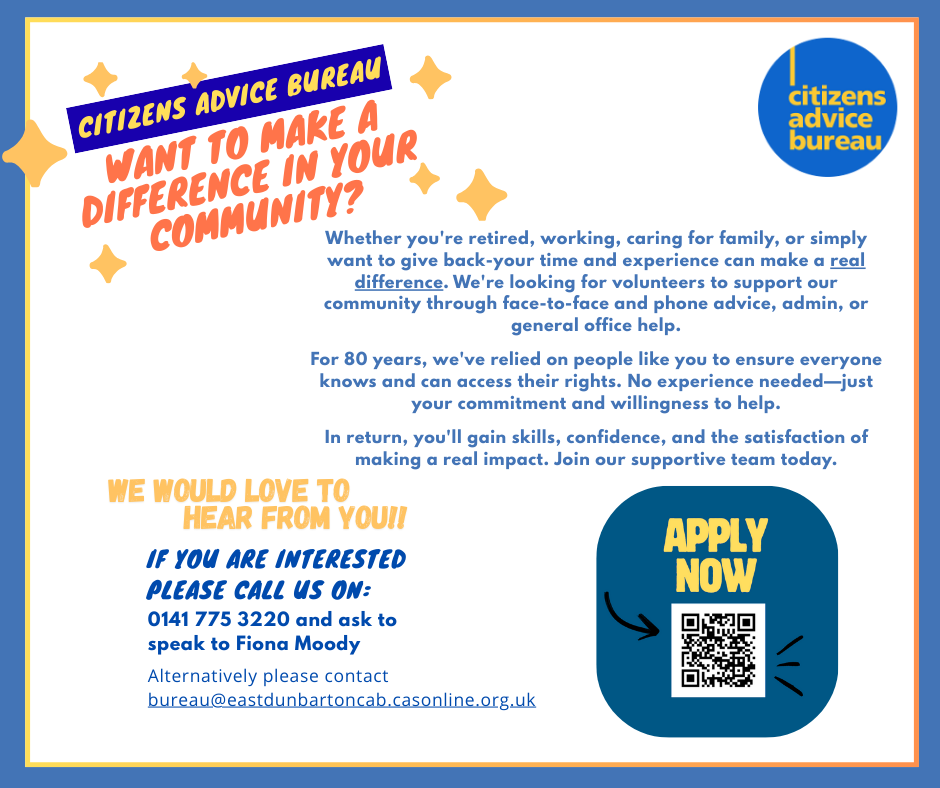 Are you retired, looking to get back into work or do you have some free time to give to others? Then, why not volunteer with us at East Dunbartonshire Citizens Advice Bureau? There are lots of opportunities for you to help, and it can be extremely rewarding. You can use your skills to help others, make a difference and give something back to your community. See our Volunteer page here to find out more.